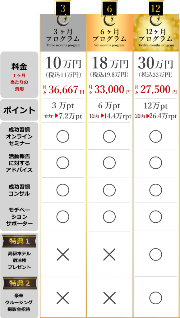 | 3ヶ月プログラム | 6ヶ月プログラム | 12ヶ月プログラム | |