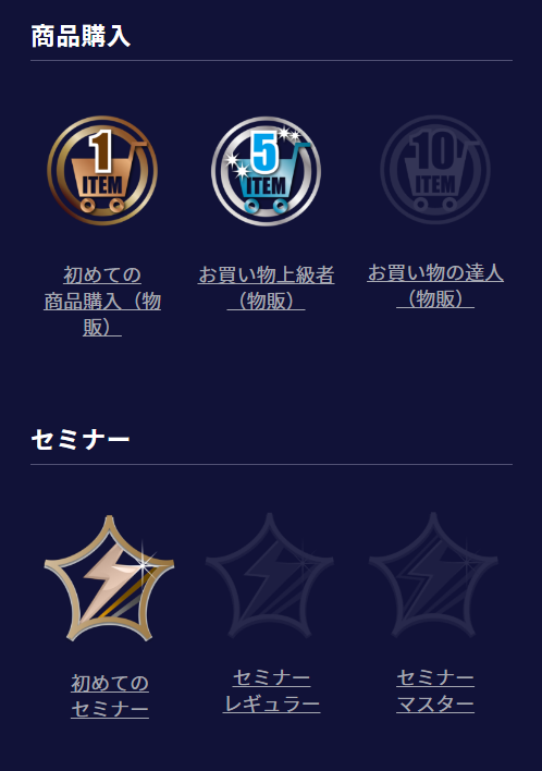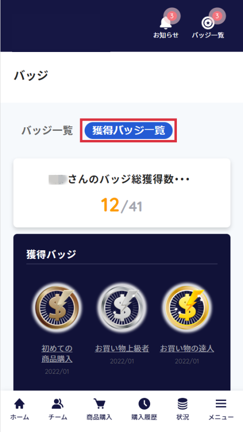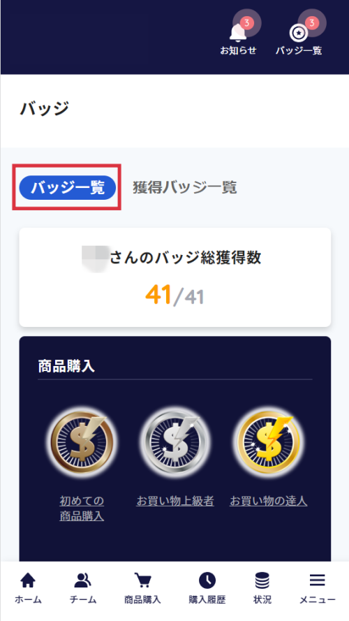 「バッジ一覧ページ」では、獲得済・未獲得のバッジをすべて一覧で確認できます。