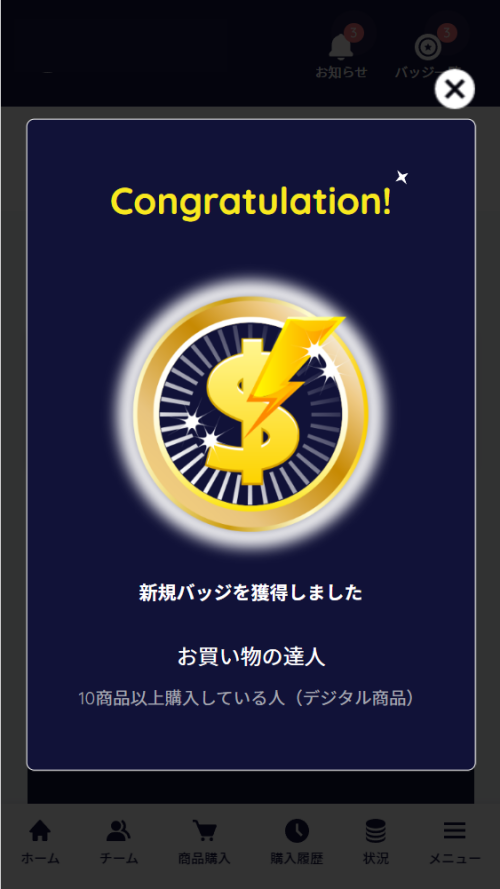 新しくバッジを獲得している際にバッジ一覧ページにアクセスすると、「Congratulations!」のポップアップが表示されます。